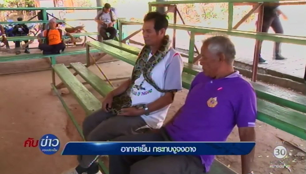 ขอนแก่น 6 ธ.ค.-ผู้เลี้ยงงูจงอางและงูเหลือมไว้แสดงให้นักท่องเที่ยวชม จ.ข่อนแก่น เร่งสร้างความอบอุ่นให้กับงู หลังอากาศหนาวเย็น หวั่นงูป่วย พบปีที่แล้วมีงูตายเพราะอากาศหนาว 4 ตัว