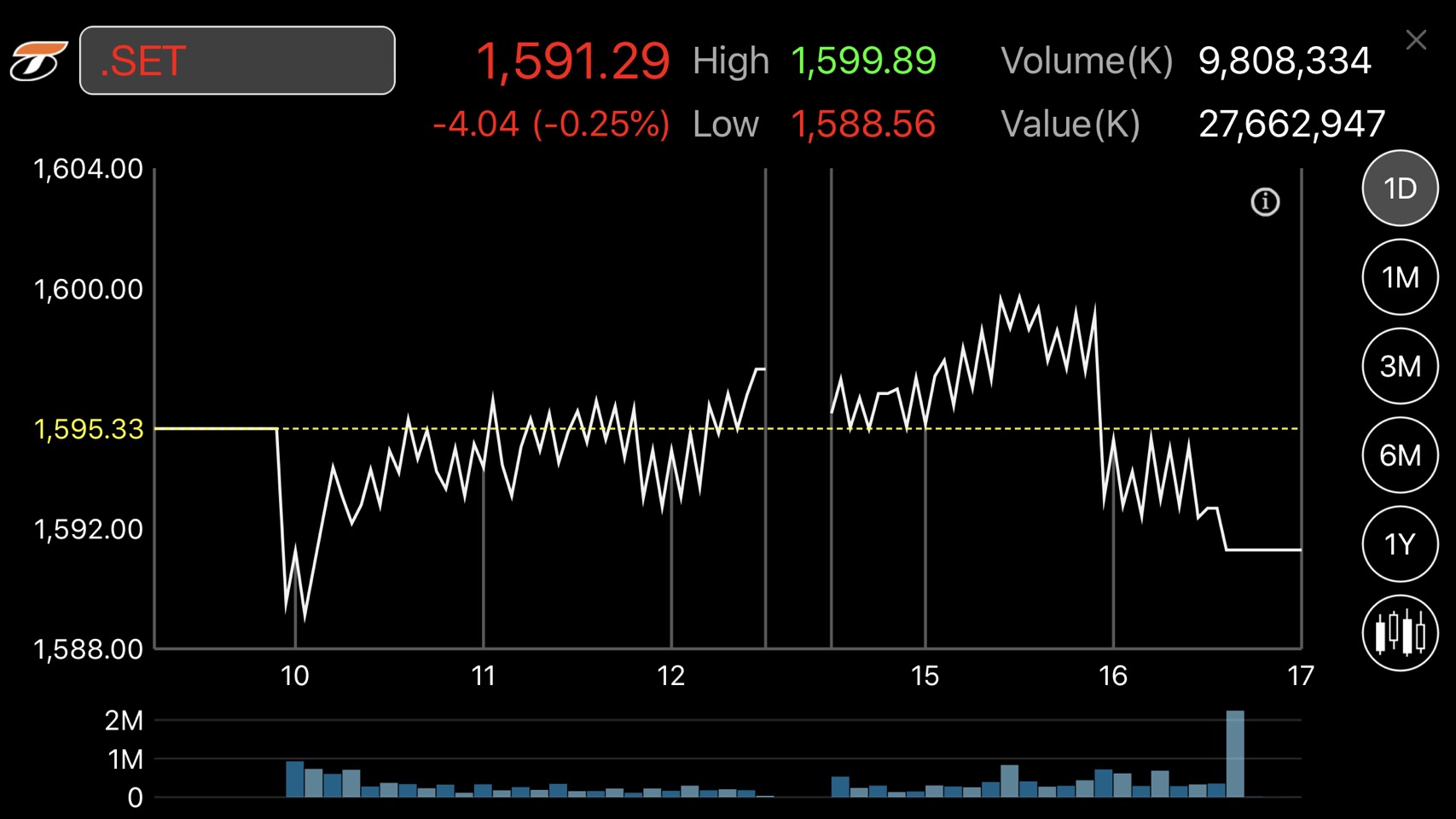 ผู้สื่อข่าวรายงานว่า ตลาดหลักทรัพย์ปิดวันนี้ที่ระดับ 1,591.29 จุด ลดลง 4.04 จุด (-0.25%) มูลค่าการซื้อขาย 27,662.95 ล้านบาท