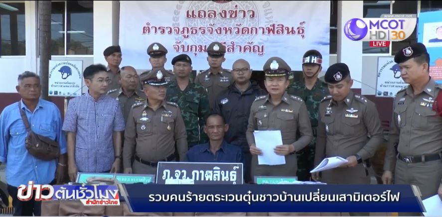 กาฬสินธุ์ 25 ธ.ค.- ตำรวจ สภ.คำม่วง จ.กาฬสินธุ์ และตำรวจ สภ.วังสามหมอ จ.อุดรธานี ร่วมกันจับกุมตัวชายวัย 49 ปี ผู้ต้องหาปลอมตัวเป็นเจ้าหน้าที่การไฟฟ้าฯ ตระเวนหลอกชาวบ้านให้เปลี่ยนสายไฟ เสาไฟ มิเตอร์ และเรียกเก็บค่าไฟรายละหลายพันถึงหมื่นบาท มีผู้เสียหายหลงเชื่อหลายราย
