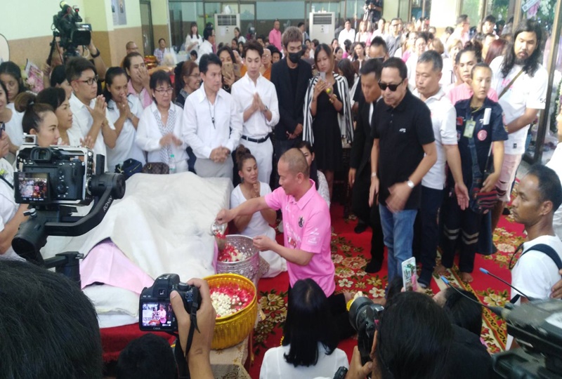 กรุงเทพฯ 25 ธ.ค.- บรรยากาศรดน้ำศพ”ดม ชวนชื่น “ ตลกรุ่นใหญ่ บรรดาแขกที่มาร่วมไว้อาลัยต่างใส่เสื้อสีชมพู ตามความประสงค์ของผู้ตาย