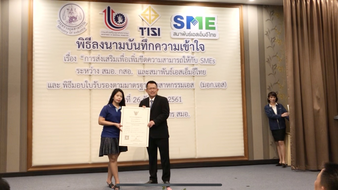 นายสมชาย หาญหิรัญ รัฐมนตรีช่วยว่าการกระทรวงอุตสาหกรรมเป็นประธานในพิธีมอบใบรับรองมาตรฐานอุตสาหกรรม มอก.S แก่ผู้ประกอบการวิสาหกิจขนาดกลางและขนาดย่อม (เอสเอ็มอี) ซึ่งเป็นมาตรฐานอุตสาหกรรมใหม่ที่ สมอ.จัดทำขึ้นเป็นการเฉพาะตามนโยบายของนายอุตตม สาวนายน รัฐมนตรีว่าการกระทรวงอุตสาหกรรม เพื่อยกระดับขีดความสามารถของผู้ประกอบการเอสเอ็มอี โดยมีมาตรฐานรองรับที่เหมาะสมกับสินค้าและบริการที่ออกแบบและผลิตขึ้นแบบเฉพาะเจาะจงตามความต้องการกลุ่มลูกค้าตลาดเป้าหมายด้วยมาตรฐาน และมีคุณภาพสม่ำเสมอ