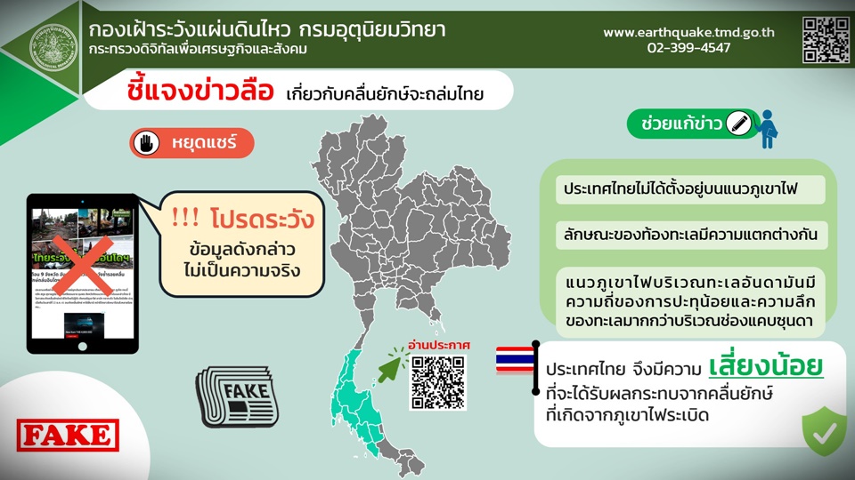 กองเฝ้าระวังแผ่นดินไหว กรมอุตุนิยมวิทยา กระทรวงดิจิทัลเพื่อเศรษฐกิจและสังคม ออกเอกสารแถลงชี้แจง เรื่อง ข่าวลือแจ้งเตือน 9 จังหวัดอันดามัน อ่าวไทย ระวังซ้ำรอยคลื่นยักษ์ถล่มอินโดฯ โดยระบุว่า