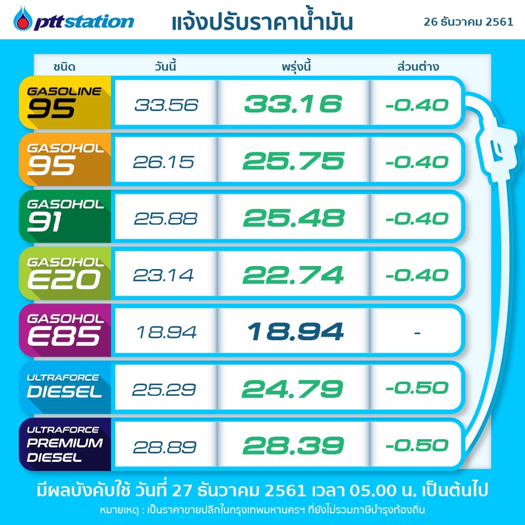 บมจ.ปตท.และบางจากฯ ปรับลดราคาขายปลีกน้ำมันกลุ่มเบนซินและแก๊สโซฮอล์ทุกชนิดลง 40 สตางค์ต่อลิตร เว้น E85 คงเดิม ส่วนดีเซลและดีเซลพรีเมียมลดลง 50 สตางค์ต่อลิตร มีผล 27 ธันวาคม 2561 เวลา 05.00 น. เป็นต้นไป โดยราคาขายปลีกจะเป็นดังนี้ เบนซิน 95 ลิตรละ 33.16 บาท แก๊สโซฮอล์ 95 ลิตรละ 25.75 บาท E20 ลิตรละ 22.74 บาท แก๊สโซฮอล์ 91 ลิตรละ 25.48 บาท E85 ลิตรละ 18.94 บาท ดีเซล 24.79 บาท และดีเซลพรีเมี่ยม 28.39 บาทต่อลิตร โดยราคาขายปลีกข้างต้นยังไม่รวมภาษีบำรุงกรุงเทพมหานคร.-สำนักข่าวไทย