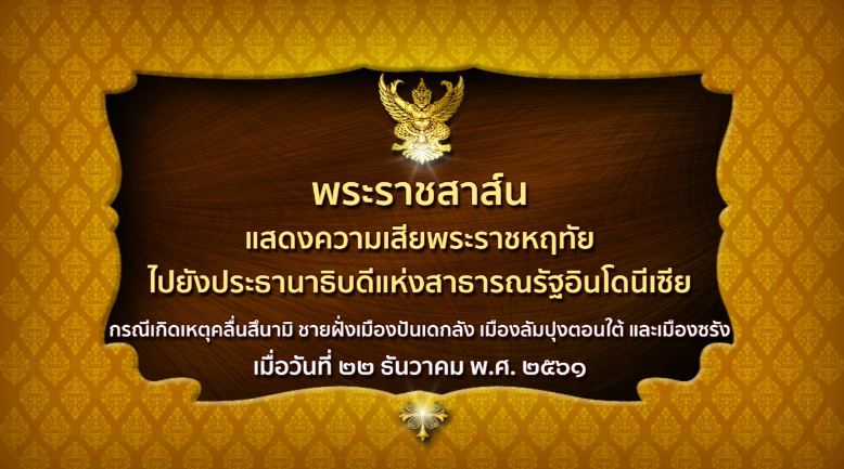 26 ธ.ค. – สมเด็จพระเจ้าอยู่หัว ทรงพระกรุณาโปรดเกล้าฯ ให้ส่งข้อความพระราชสาส์นแสดงความเสียพระราชหฤทัย ไปยังประธานาธิบดีแห่งสาธารณรัฐอินโดนีเซีย กรณีเกิดเหตุคลื่นสึนามิ เมื่อวันที่ 22 ธันวาคม 2561