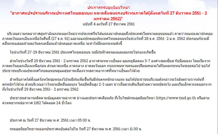 สำหรับภาคใต้ตั้งแต่ จ.ชุมพร ลงไป จะมีฝนเพิ่มขึ้นกับมีฝนตกหนักบางแห่ง ขอให้ประชาชนบริเวณดังกล่าวระวังอันตรายจากฝนที่ตกหนักไว้ด้วย ส่วนบริเวณอ่าวไทยจะมีคลื่นลมแรง คลื่นสูง 2-3 เมตร ชาวเรือควรเดินเรือด้วยความระมัดระวัง และเรือเล็กควรงดออกจากฝั่งในช่วงวันที่ 29 ธันวาคม 2561 – 2 มกราคม 2562