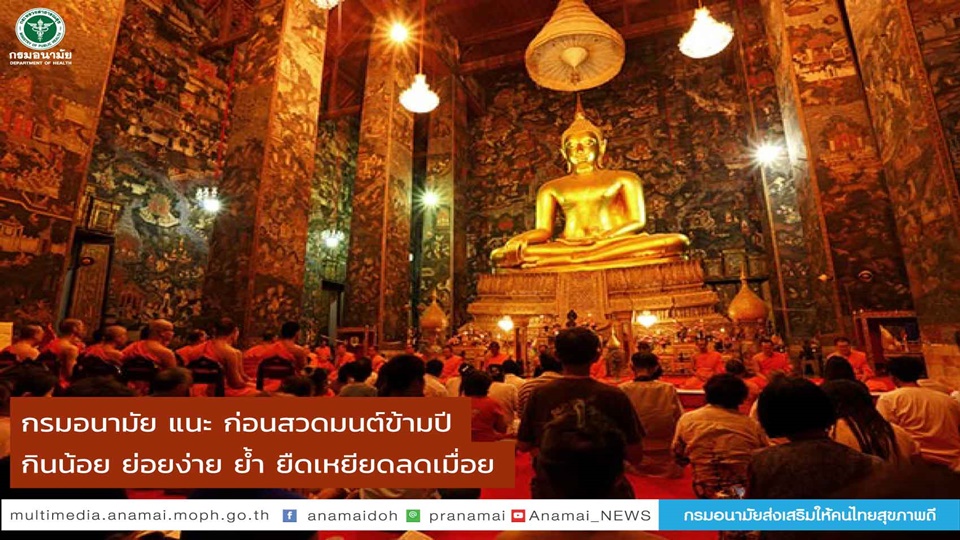 กรมอนามัย27ธ.ค.-กรมอนามัย ชวนคนไทยเตรียมร่างกายพร้อมสวดมนต์ข้ามปี แนะยืดเหยียดคลายเมื่อยก่อนและระหว่างสวดมนต์ ควรกินแต่พออิ่ม เน้นอาหารย่อยง่าย เช่น เนื้อปลา ผัก ผลไม้