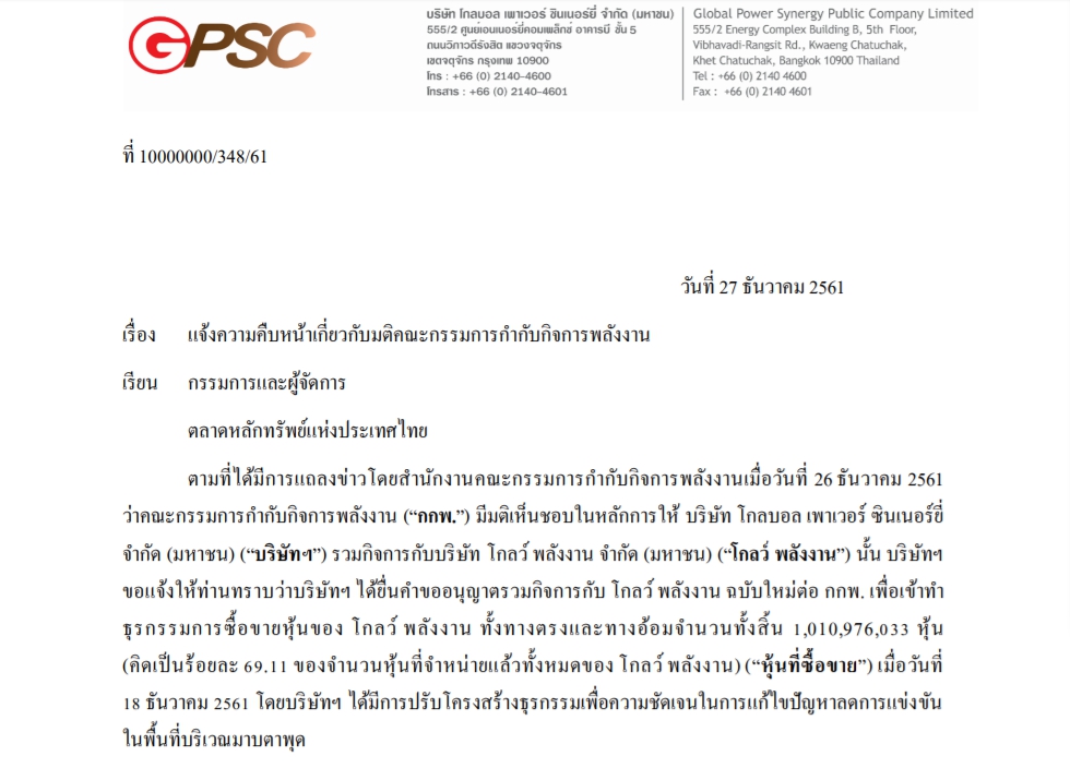 นายชวลิต ทิพพาวนิช ประธานเจ้าหน้าที่บริหารและกรรมการผู้จัดการใหญ่ บริษัท โกลบอล เพาเวอร์ ซินเนอร์ยี่ จำกัด(มหาชน) หรือจีพีเอสซี แจ้งตลาดหลักทรัพย์แห่งประเทศไทย (ตลท.) ว่า เมื่อวันที่ 26 ธันวาคมที่ผ่านมา สำนักงานคณะกรรมการกำกับกิจการพลังงาน (กกพ.) มีมติเห็นชอบในหลักการให้จีพีเอสซีรวมกิจการกับบริษัท โกลว์ พลังงาน จำ กัด (มหาชน) หรือโกลว์ พลังงาน นั้น บริษทัฯ ได้ยื่นคำขออนุญาตรวมกิจการกับโกลว์ พลังงาน ฉบับใหม่ต่อ กกพ. เพื่อเข้าทำธุรกรรมการซื้อขายหุ้นของโกลว์พลังงานทั้งทางตรงและทางอ้อม 1,010,976,033 หุ้น คิดเป็นร้อยละ 69.11 ของจำ นวนหุ้นที่จำหน่ายแล้วทั้งหมดของโกลว์พลงังาน เมื่อวันที่ 18 ธันวาคม 2561 โดยบริษัทฯ ได้มีการปรับโครงสร้างธุรกรรมเพื่อความชัดเจนในการแก้ไขปัญหาลดการแข่งขันในพื้นที่บริเวณมาบตาพุด บริษัทฯ ได้รับทราบมติเห็นชอบในหลักการของ กกพ.จากข้อแถลงข่าวของ กกพ.ที่กำหนดเงื่อนไขบังคับก่อนให้โกลว์ พลังงานต้องขายกิจการของบริษัท โกลว์ เอสพีพี 1 จ ากัด (“SPP1”) ให้เสร็จก่อน หรือเวลาเดียวกับที่บริษัทฯ รวมกิจการกับโกลว์ พลังงาน และอยู่ระหว่างรอผลการอนุมัติอย่างเป็นทางการจาก กกพ. โดยบริษัทฯ มีความยินดีที่จะปฏิบัติตามเงื่อนไขบังคับหลังการรวมกิจการตามที่ กกพ. กำ หนดในข้อแถลงข่าวและพร้อมที่จะสนับสนุนให้มีการแข่งขันที่เป็นธรรมในธุรกิจพลงังาน เพื่อสร้างความมั่นคงและเสถียรภาพในการให้บริการพลังงานแก่ลูกค้า