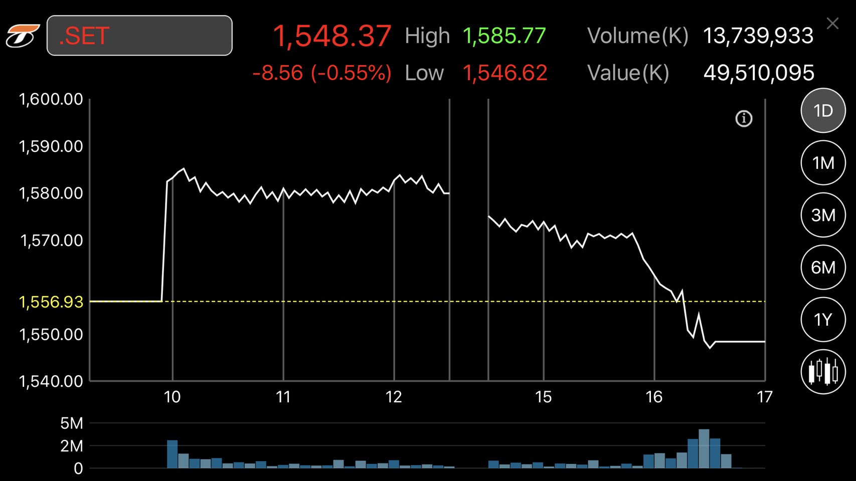 ผู้สื่อข่าวรายงานว่าดัชนีตลาดหลักทรัพย์ฯ ปิดวันนี้ที่ระดับ 1,548.37 จุด ลดลง 8.56 จุด หรือร้อยละ 0.55 มูลค่าการซื้อขาย 49,510.10 ล้านบาท การซื้อขายดัชนีเคลื่อนไหวในแดนบวกเป็นส่วนใหญ่ และพลิกกลับเป็นแดนลบในช่วงท้ายการเทรดภาคบ่าย โดยดัชนีฯ แตะจุดสูงสุดที่ 1,585.77 จุด และแตะจุดต่ำสุดที่ระดับ 1,546.62 จุด