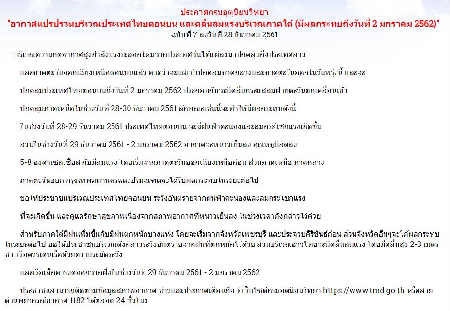 ส่วนในช่วงวันที่ 29 ธันวาคม 2561 – 2 มกราคม 2562 อากาศจะหนาวเย็นลง อุณหภูมิลดลง 5-8 องศาเซลเซียส กับมีลมแรง โดยเริ่มจากภาคตะวันออกเฉียงเหนือก่อน ส่วนภาคเหนือ ภาคกลาง ภาคตะวันออก กรุงเทพมหานครและปริมณฑลจะได้รับผลกระทบในระยะต่อไป