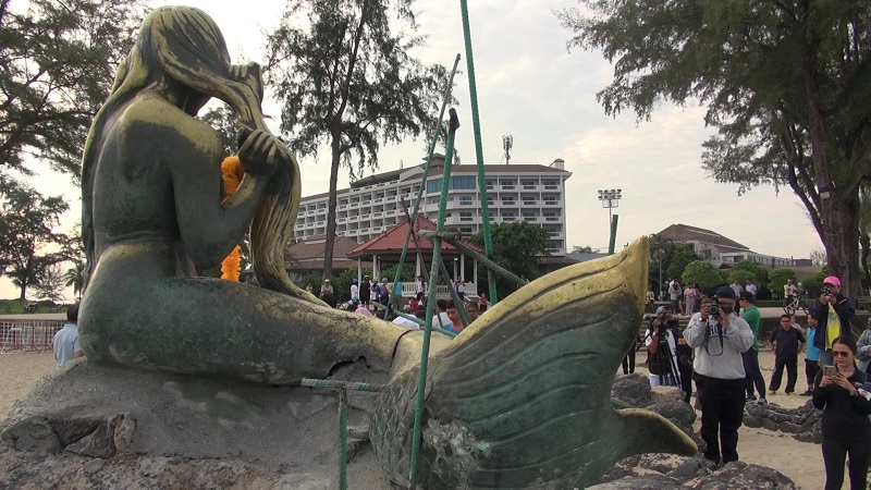 นายไพโรจน์ จริตงาม และนายศักระ กปิลกาญจน์ รองผู้ว่าราชการจังหวัดสงขลา พร้อมตัวแทนส่วนราชการและประชาชนที่มาออกกำลังกายมาถ่ายภาพร่วมกันกับรูปปั้นนางเงือกทอง หาดสมิหลา อ.เมือง เพื่อแสดงออกเชิงสัญลักษณ์ในการสามัคคี และไม่ยอมรับการใช้ความรุนแรงของผู้ก่อเหตุลอบวางระเบิดเมื่อคืนวันที่ 26 ธ.ค.ที่ผ่านมา 2 ลูก และเช้ารุ่งขึ้นอีก 1 ลูก ส่งผลให้รูปปั้นนางเงือกทองประติมากรรมได้รับความเสียหายส่วนหางนางเงือกขาด ซึ่งรูปปั้นดังกล่าวมีอายุ 52 ปี เช่นเดียวกับรูปปั้นหนูแมว ที่อยู่ห่างกันประมาณ 300 เมตร และวันนี้จังหวัดสงขลาได้จัดกิจกรรมรับขวัญเงือกทอง หลังจากเจ้าหน้าที่หลายหน่วยงานได้ตรวจพิสูจน์และเก็บหลักฐานแล้วเสร็จ พร้อมคืนพื้นที่ให้เทศบาลนครสงขลาดำเนินการซ่อมแซมส่วนหางนางเงือกให้กลับมาสวยงามอีกครั้ง โดยมีประชาชนและนักท่องเที่ยวเข้าเที่ยวชมและพักผ่อนหย่อนใจได้ตามปกติ รวมทั้งร้านค้าเปิดทำการได้เช่นกัน