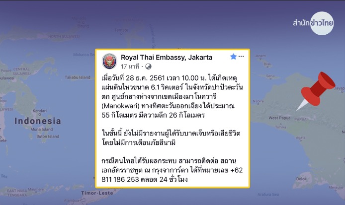 28 ธ.ค.-สถานเอกอัครราชทูตไทย ณ กรุงจาการ์ตา แจ้งยังไม่มีรายงานผู้ได้รับบาดเจ็บหรือเสียชีวิตจากเหตุแผ่นดินไหว ในจังหวัดปาปัวตะวันตก ขณะที่ไม่มีการเตือนภัยสึนามิ