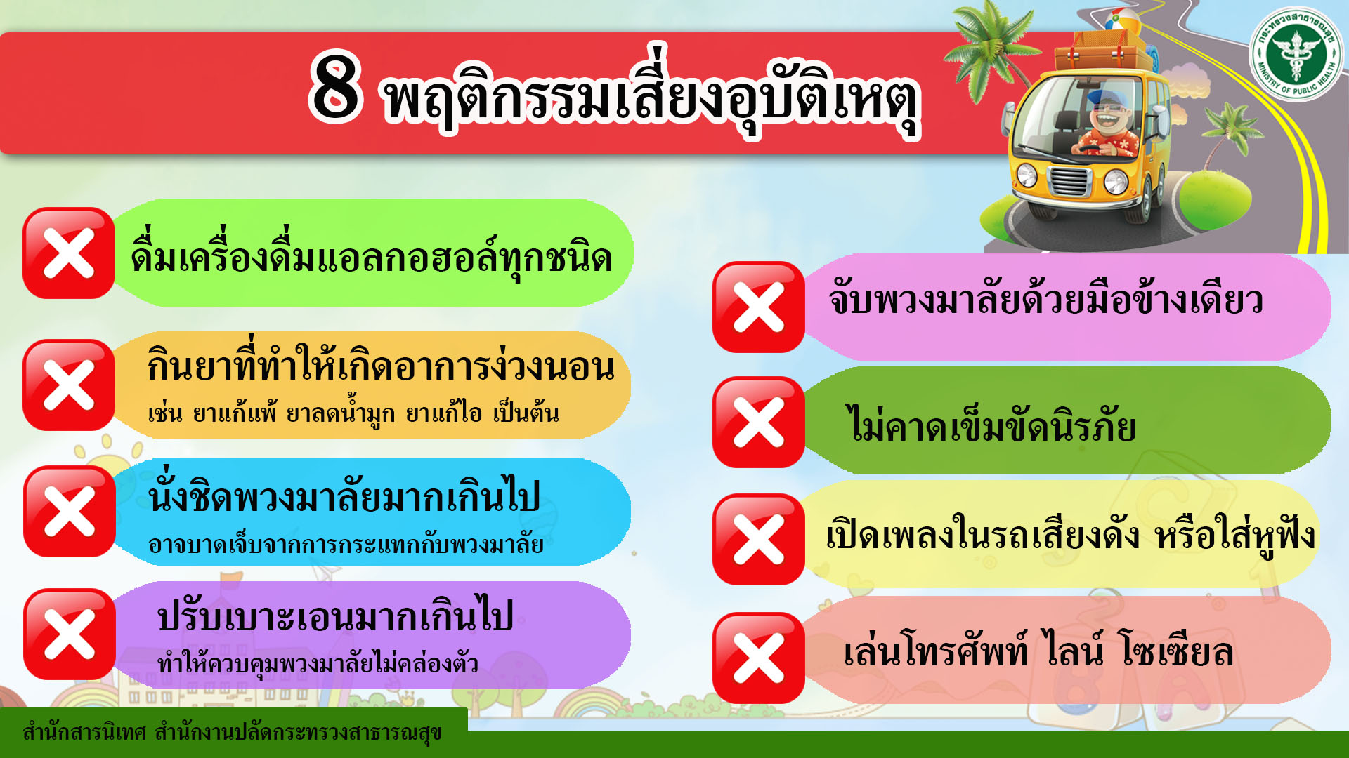 นายแพทย์ประพนธ์ ตั้งศรีเกียรติกุล รองปลัดกระทรวงสาธารณสุข กล่าว ถึงการเดินทางช่วงเทศกาลส่งท้ายปีเก่าต้อนรับปีใหม่ว่า ผู้ขับขี่รถยนต์ รถจักรยานยนต์ ขอให้ปฏิบัติตามกฎหมายอย่างเคร่งครัด ควรเลี่ยงพฤติกรรมเสี่ยงที่อาจทำให้เกิดอุบัติเหตุจราจร 8 ประการ ได้แก่ 1.ดื่มเครื่องดื่มแอลกอฮอล์ทุกชนิด 2.กินยาที่ทำให้เกิดอาการง่วง เช่น ยาแก้แพ้ยาลดน้ำมูก ยาแก้ไอ ยาคลายเครียด ยาคลายกล้ามเนื้อ ยาแก้ไข้หวัด เป็นต้น 3.นั่งชิดพวงมาลัยมากเกินไป จะทำให้ข้อศอกงอกว่าปกติ หมุนพวงมาลัยไม่คล่อง อาจบาดเจ็บจากการกระแทกกับพวงมาลัย และแรงระเบิดจากถุงลมนิรภัย 4.การปรับเบาะให้เอนมากเกินไป ทำให้การควบคุมพวงมาลัยไม่คล่องตัว ขาดความฉับไวและความแม่นยำ การมองกระจกมองหลังและมองข้างต้องเบนแนวสายตามากกว่าปกติ เกิดการเมื่อยล้า 5.จับพวงมาลัยตามความสบายของตัวเอง ควรจับพวงมาลัยให้ถูกต้องคือ มือซ้ายจับที่ตำแหน่ง 9-10 นาฬิกา มือขวาที่ตำแหน่ง 2-3 นาฬิกา และจับทั้ง 2 มือเสมอ 6.ไม่คาดเข็มขัดนิรภัย เมื่อเกิดอุบัติเหตุขึ้นคนขับจะพุ่งเข้าหาพวงมาลัยหรือกระจกหน้ารถยนต์ 7.การฟังเพลงดังๆ ในรถ หรือใส่หูฟัง จะทำให้ไม่ได้ยินเสียงผิดปกติ หรือเสียงจากภายนอกรถ 8.การเล่นโทรศัพท์ ไลน์ โซเชียลขณะขับรถ เพราะการละสายตาจากถนนแม้จะเป็นช่วงเวลาสั้นๆ เพียงไม่กี่วินาที ก็ทำให้เสียสมาธิในการขับขี่เช่น เหยียบเบรกหรือหักพวงมาลัยช้าลง