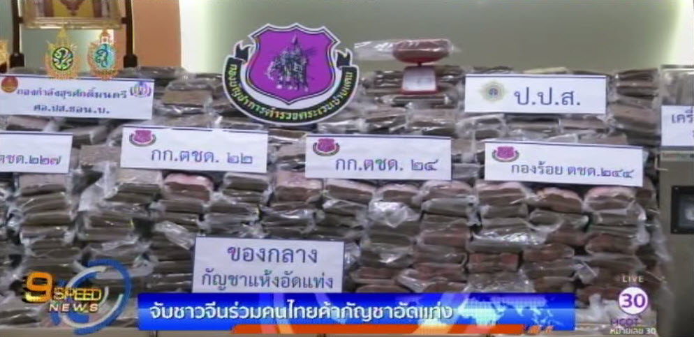 รองผู้บัญชาการตำรวจตระเวนชายแดน หรือ ตชด. เปิดเผยผลการจับกุมกัญชาแห้งอัดแท่งน้ำหนัก 3,155 กิโลกรัม หลังร่วมกับกองกำลังสุรศักดิ์มนตรี ศูนย์รักษาความปลอดภัย กองทัพไทย และเจ้าหน้าที่ปราบปรามยาเสพติด ตรวจยึดได้ที่โกดังแห่งหนึ่งใน อ.บ่อทอง จ.ชลบุรี พร้อมจับกุมนายฉี เจ ซัน สัญชาติจีนไต้หวัน ที่เข้ามาเปิดธุรกิจบังหน้า และนายสุพรชัย ชูแก้ว คนเฝ้าโกดัง หลังเจ้าหน้าที่สืบทราบว่า มีการลักลอบขนกัญชาแห้งอัดแท่งจาก สปป.ลาว ผ่านไทย เพื่อส่งไปจำหน่ายประเทศที่สาม อยู่ระหว่างขยายผลจับกุมผู้ร่วมขบวนการมาดำเนินคดี.-สำนักข่าวไทย