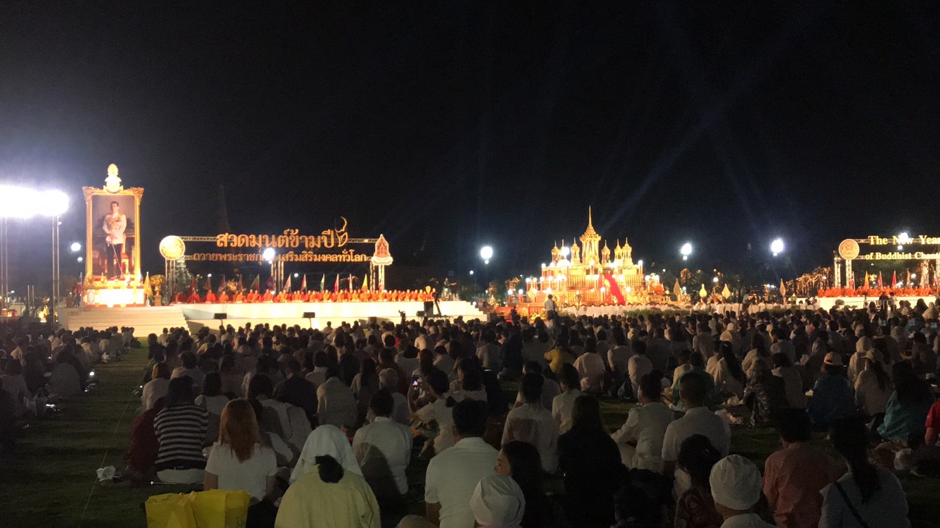 บริเวณมณฑลพิธีท้องสนามหลวง ประชาชนทยอยเดินทางมาร่วมพิธี “สวดมนต์ข้ามปี ถวายพระราชกุศล เสริมสิริมงคลทั่วโลก” ส่งท้ายปีเก่าวิถีไทยต้อนรับปีใหม่วิถีธรรม พ.ศ.2562 ณ มณฑลท้องสนามหลวง เพื่อความเป็นสิริมงคลในการเริ่มต้นพุทธศักราชใหม่ 2562 ส่วนใหญ่เลือกสวมใส่เสื้อผ้าสีขาว มีทั้งมาเป็นกลุ่มเพื่อน และมากันทั้งครอบครัว โดยมีเจ้าหน้าจัดเตรียมหนังสือสวดมนต์ไว้ให้กับประชาชนที่มาร่วมพิธีในค่ำคืนนี้
