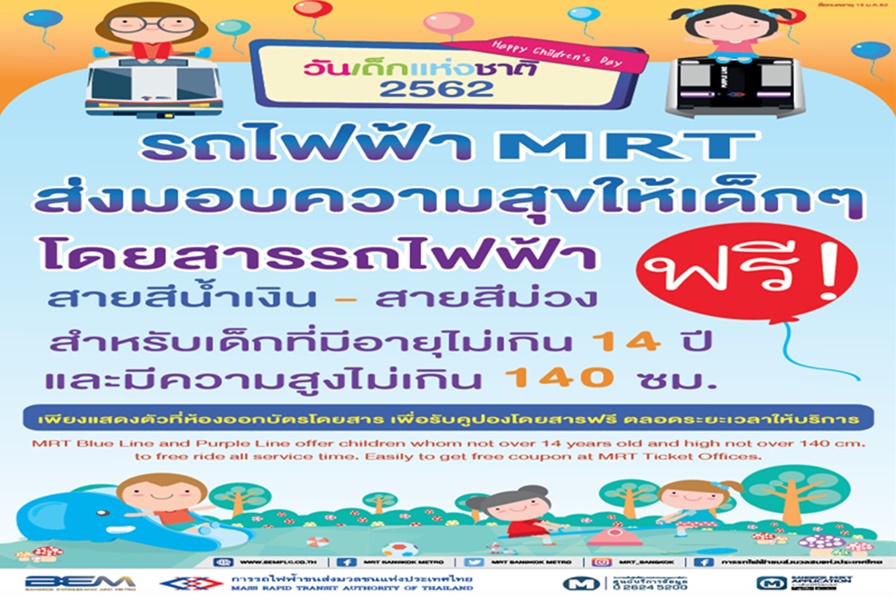 บริษัท ทางด่วนและรถไฟฟ้ากรุงเทพ จำกัด (มหาชน) หรือ BEM ร่วมกับการรถไฟฟ้าขนส่งมวลชนแห่งประเทศไทย (รฟม.) ส่งมอบความสุขให้เด็ก ๆ ด้วยการโดยสารรถไฟฟ้า MRT ฟรี ทั้ง 2 สาย สายเฉลิมรัชมงคล (สายสีน้ำเงิน) และสายฉลองรัชธรรม (สายสีม่วง) เนื่องในวันเด็กแห่งชาติ วันที่ 12 มกราคม 2562 สำหรับเด็กที่มีอายุไม่เกิน 14 ปี และมีความสูงไม่เกิน 140 ซม.เพียงแสดงตัวที่ห้องออกบัตรโดยสารเพื่อรับคูปองโดยสารรถไฟฟ้าฟรี ตลอดระยะเวลาให้บริการ เพื่อเสริมสร้างประสบการณ์ให้เด็ก ๆ ในการใช้ระบบขนส่งสาธารณะ.-สำนักข่าวไทย