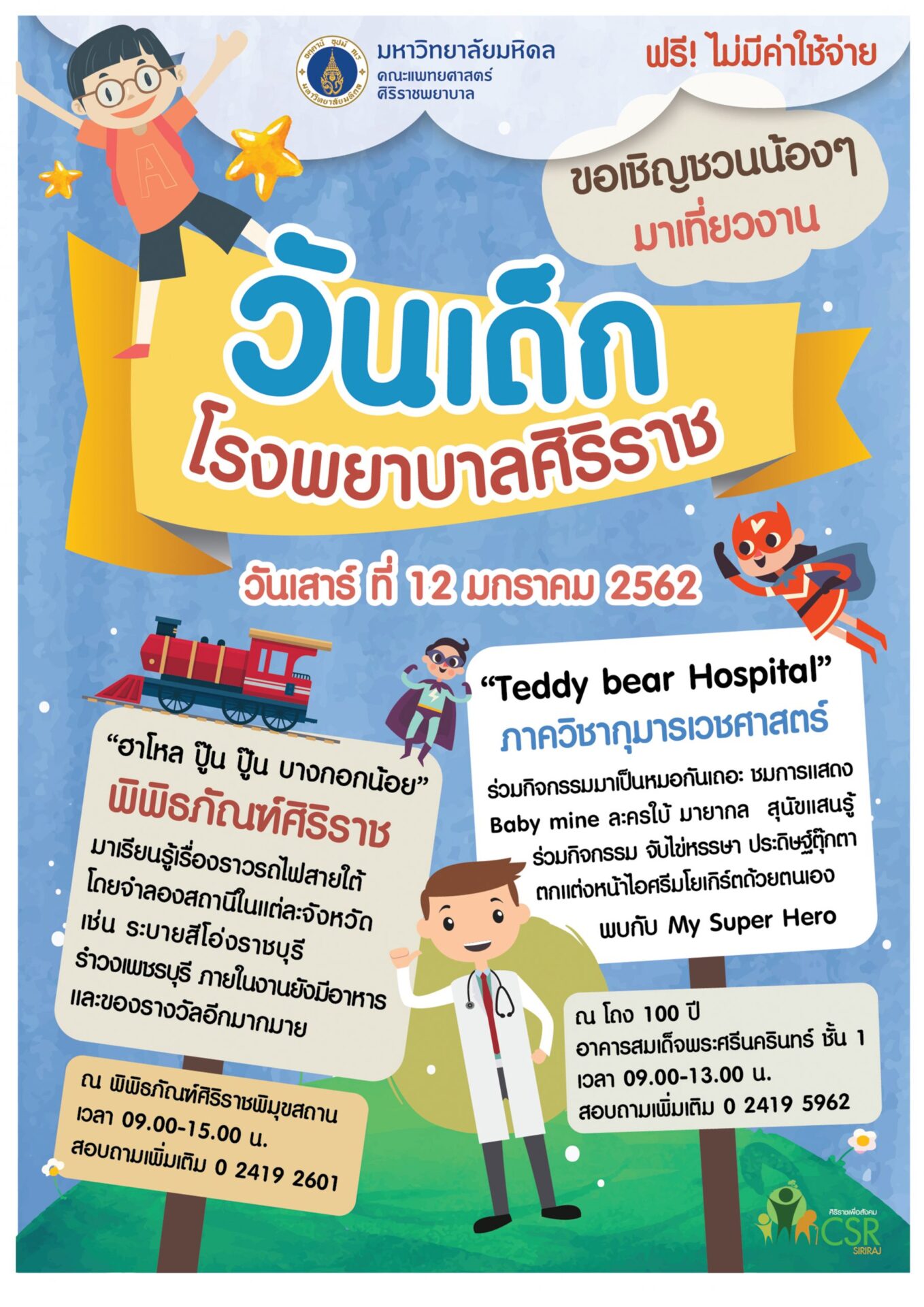 คณะแพทยศาสตร์ศิริราชพยาบาล มหาวิทยาลัยมหิดล โดยภาควิชากุมารเวชศาสตร์ จะจัดงานวันเด็กแห่งชาติ ประจำปี 2562 “วันเด็ก@ศิริราช 2562” ในวันเสาร์ที่ 12 มกราคม 2562 เวลา 09.00 – 13.00 น. ณ โถงอาคาร ๑๐๐ ปี สมเด็จพระศรีนครินทร์ รพ.ศิริราช เพลิดเพลินกับกิจกรรมบันเทิงบนเวที โชว์ “Over the limit talent” “หนูทำได้@ศิริราช 2562” “มาล้างมือกันเถอะ#1: สอนการล้างมือที่ถูกวิธี” “สุนัขแสนรู้” “มาล้างมือกันเถอะ #2: สองกล้องดูจุลินทรีย์” “ดนตรี โดยน้องวุฒิและเพื่อน” ร่วมสันทนาการ “My Hero” ถ่ายรูปร่วมกับซุปเปอร์ฮีโร่ “ลูกปัดมหัศจรรย์: ร้อยลูกปัดด้วยตนเอง” “ตุ๊กตาแกนกระดาษ” “ภาพล่องหน” “ระบายสีตามจินตนาการพร้อมรับรูปกลับบ้าน” “DIY แต่งหน้าไอศครีมจาก Hello Yogert” “Teddy Bear Hospital@Siriraj: เด็กจะได้เล่นบทบาทสมมติเป็นแพทย์ พยาบาลตามจินตนาการในบรรยากาศโรงพยาบาลที่เป็นมิตรกับเด็ก” “English for Fun: ภาษาอังกฤษง่ายนิดเดียว พร้อมกิจกรรมแต่งหน้าเค้ก Puppet show” “Lovely Balloon: พี่ต๋องบิดลูกโป่งเป็นรูปต่าง ๆ มอบให้เด็ก” “สุขภาพดี…ชิว…ชิว: สอนวิธีการดูแลสุขภาพเด็กเบื้องต้น” และร่วมลุ้นจับไข่หรรษาพาโชค พร้อมรับของขวัญของรางวัลมากมาย ขอเชิญชวนผู้ปกครองพาเด็ก ๆ ร่วมงานฟรี…ไม่มีค่าใช้จ่าย สอบถามเพิ่มเติม โทร. 0 2419 5962
