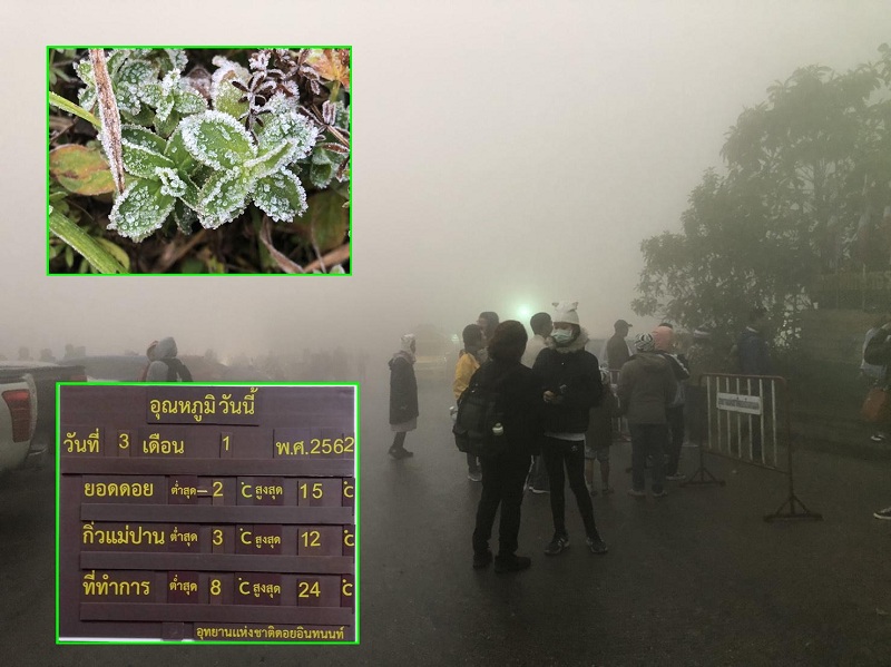 นายวสันต์ จันทร์เทพ ผู้ช่วยหัวหน้าอุทยานแห่งชาติดอยอินทนนท์ อ.จอมทอง จ.เชียงใหม่ เปิดเผยว่า เช้านี้ (3 ม.ค.) อุณหภูมิต่ำสุดยอดดอย -2 องศาเซลเซียส เกิดปรากฏการณ์น้ำค้างแข็งหรือแม่คะนิ้งบริเวณจุดชมวิว กม.ที่ 43-45 ให้นักท่องเที่ยวได้ชมอย่างต่อเนื่องและเก็บภาพความประทับใจหลังเทศกาลปีใหม่ ท่ามกลางไอหมอก ขณะที่กิ่วแม่ปานอุณหภูมิต่ำสุด 3 องศาฯ และที่ทำการอุทยานฯ 8 องศาฯ ส่วนจำนวนนักท่องเที่ยวในพื้นที่หลังปีใหม่เริ่มเบาบางเหลือประมาณ 7,600 คน ต่างจากก่อนช่วงเทศกาลเนืองแน่นมาก เพราะส่วนใหญ่เดินทางกลับไปทำงาน.-สำนักข่าวไทย