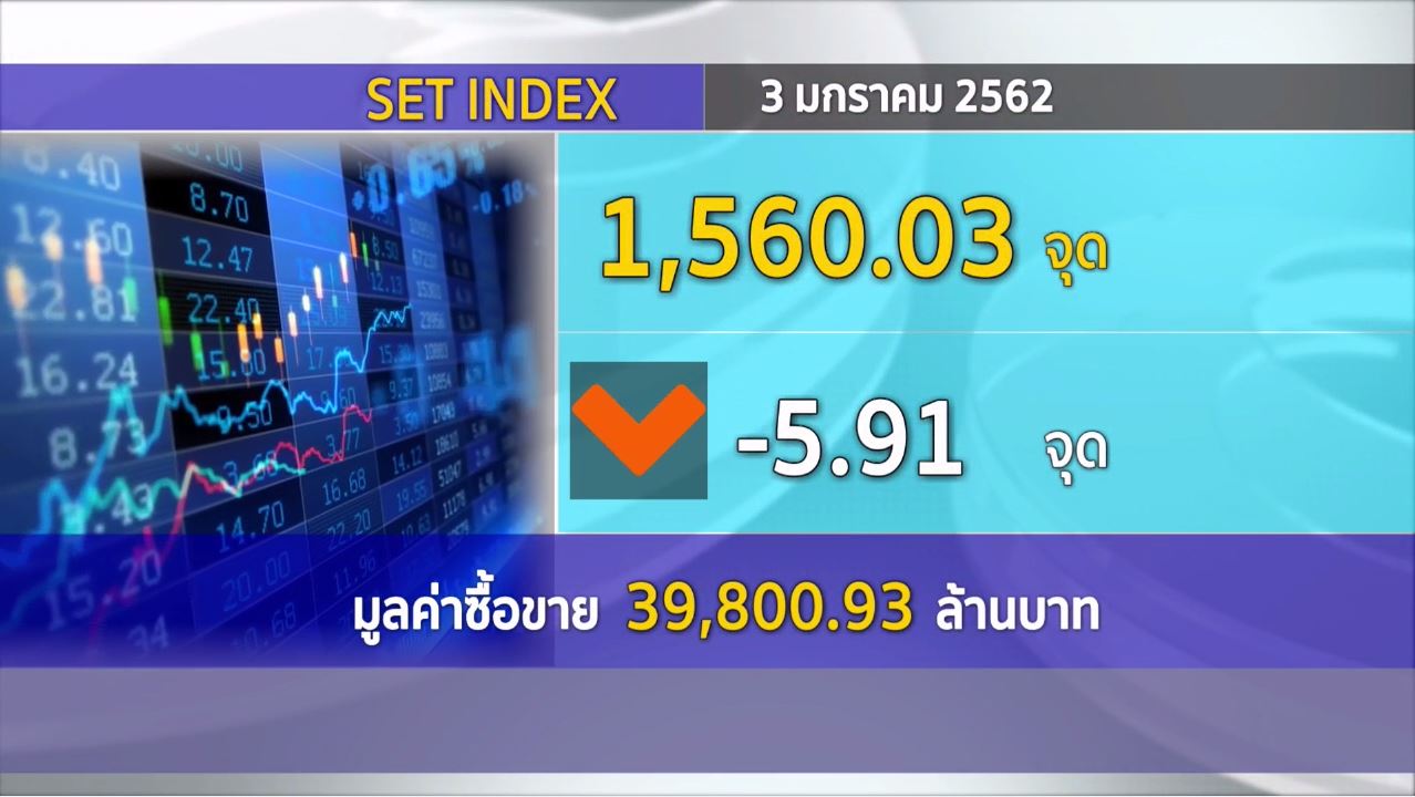 กทม. 3 ม.ค.-ตลาดหุ้นไทย (3 ม.ค.) ปิดการซื้อขายที่ 1,560.03 จุด ลดลง 5.91 จุด มูลค่าการซื้อขาย 39,800.93 ล้านบาท.-สำนักข่าวไทย