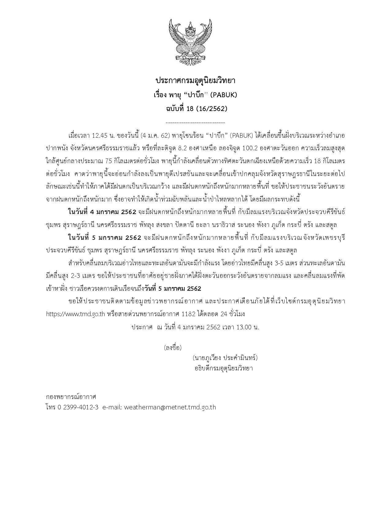 ภูมิภาค 4 ม.ค. – พายุโซนร้อน “ปาบึก” ขึ้นฝั่งประเทศไทยแล้ว บริเวณระหว่าง อ.ปากพนัง จ.นครศรีธรรมราช เมื่อเวลา 12.45 น.ที่ผ่านมา โดยกรมอุตุนิยมวิทยา ออกประกาศฉบับที่ 18 ระบุว่า พายุปาบึกกำลังเคลื่อนตัวไปทางทิศตะวันตกเฉียงใต้ ด้วยความเร็ว 18 กิโลเมตร/ชั่วโมง คาดพายุโซนร้อนจะอ่อนกำลังลงเป็นพายุดีเปรสชัน และจะเคลื่อนเข้าปกคลุม จ.สุราษฎร์ธานี ต่อไป โดยจะส่งผลให้ภาคใต้มีฝนตกบริเวณกว้าง และมีฝนตกหนักถึงหนักมาก ตั้งแต่ จ.ประจวบคีรีขันธ์ ลงไปจนถึง จ.นราธิวาส ทั้งฝั่งอ่าวไทยและอันดามัน รวมทั้งทะเลมีคลื่นสูง 2-5 เมตร. – สำนักข่าวไทย