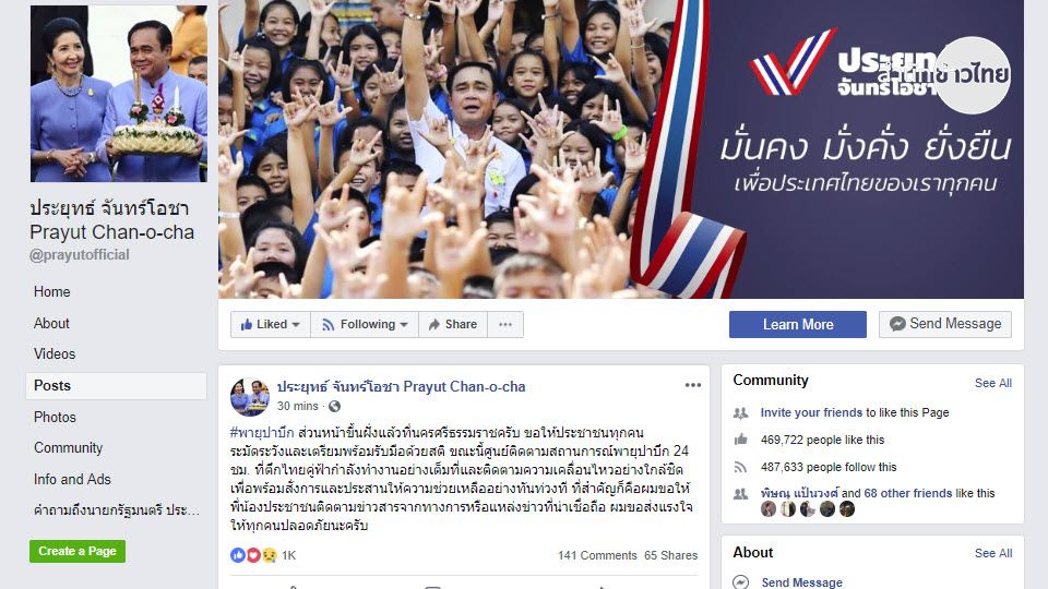 ทำเนียบฯ 4 ม.ค.- พล.อ.ประยุทธ์ จันทร์โอชา นายกรัฐมนตรี โพสต์ข้อความลงในเฟซบุ๊กส่วนตัว พร้อมติดแฮชแท็กพายุปาบึก โดยมีข้อความว่า “#พายุปาบึก ส่วนหน้าขี้นฝั่งแล้วที่นครศรีธรรมราช ขอให้ประชาชนทุกคนระมัดระวัง และเตรียมพร้อมรับมือด้วยสติ ขณะนี้ศูนย์ติดตามสถานการณ์พายุปาบึก 24 ชม. ที่ตึกไทยคู่ฟ้า กำลังทำงานอย่างเต็มที่ และติดตามความเคลื่อนไหวอย่างใกล้ชิด เพื่อพร้อมสั่งการและประสานให้ความช่วยเหลืออย่างทันท่วงที ที่สำคัญก็คือขอให้ประชาชนติดตามข่าวสารจากทางการ หรือแหล่งข่าวที่น่าเชื่อถือ ผมขอส่งแรงใจให้ทุกคนปลอดภัยนะ”.- สำนักข่าวไทย