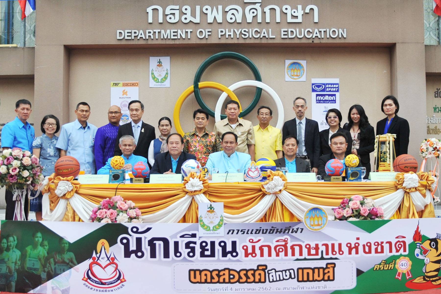 กรุงเทพ – 4 ม.ค.2562 ดร.ปัญญา หาญลำยวง อธิบดีกรมพลศึกษา เป็นประธานในการแถลงข่าวการแข่งขันกีฬานักเรียน นักศึกษาแห่งชาติ ครั้งที่ 40 ประจำปี 2562 “นครสวรรค์ศึกษาเกมส์” ที่ลานหน้าพระพลบดี สนามกีฬาแห่งชาติ โดยมี นายปรีชา เดชพันธุ์ รองผู้ว่าราชการจังหวัดนครสวรรค์,