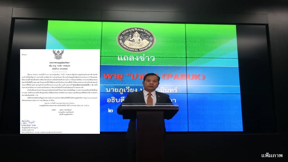 กรมอุตุนิยมวิทยาออกประกาศกรมอุตุนิยมวิทยา “พายุปาบึก” (PABUK)” ฉบับที่ 21 ลงวันที่ 05 มกราคม 2562 เมื่อเวลา 05.00 น.ที่ผ่านมา ระบุว่า