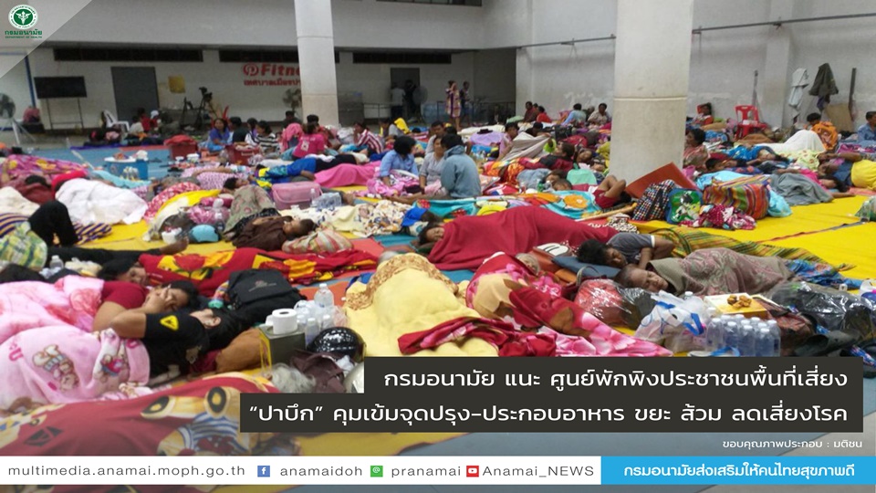 สธ. 5 ม.ค.-กรมอนามัย ห่วงสุขภาพผู้ประสบภัยจากพายุปาบึก แนะศูนย์พักพิงให้ความสำคัญในการปรุงประกอบอาหาร เน้นปรุงร้อน สะอาด ถูกสุขลักษณะ จัดการสุขาภิบาลอาหารและสิ่งแวดล้อม ขยะ ใช้ส้วมอย่างถูกต้องเพื่อป้องกันโรค