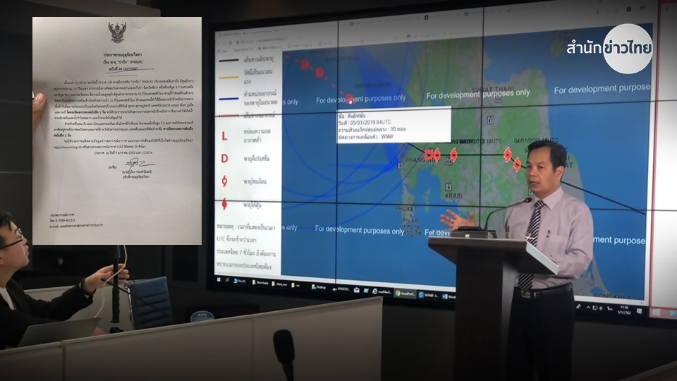 กรมอุตุฯ 5 ม.ค.-ประกาศกรมอุตุฯ ฉบับที่ 24 ‘ปาบึก’ อยู่ห่าง15 กิโลเมตรจากชายฝั่ง อ.ตะกั่วป่า จ.พังงา เตือนอาจเกิดน้ำท่วมขังในที่ลุ่มต่ำได้ ส่วนกรณีน้ำท่วม จ.สมุทรปราการ-นครปฐม เป็นอิทธิพลทางอ้อมของพายุ