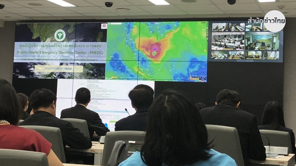บ่ายวันนี้ (5 ม.ค.) ที่ห้องประชุมศูนย์ปฏิบัติการฉุกเฉินด้านการแพทย์และสาธารณสุข อาคาร 5 ชั้น 7 อาคารสำนักงานปลัดกระทรวงสาธารณสุข จ.นนทบุรี นพ.สุขุม กาญจนพิมาย ปลัดกระทรวงสาธารณสุข (สธ.) เป็นประธานประชุมศูนย์ปฏิบัติการด้านการแพทย์ และสาธารณสุข หรือ EOC ส่วนกลาง กับศูนย์ EOC ส่วนภูมิภาคในพื้นที่เสี่ยง 16 จังหวัด ผ่านระบบวิดีโอ เพื่อติดตามสถานการณ์พายุโซนร้อนปาบึก ที่ขณะนี้อ่อนกำลังลงเป็นพายุดีเปรสชันและเคลื่อนตัวลงฝั่งทะเลอันดามันไปแล้ว