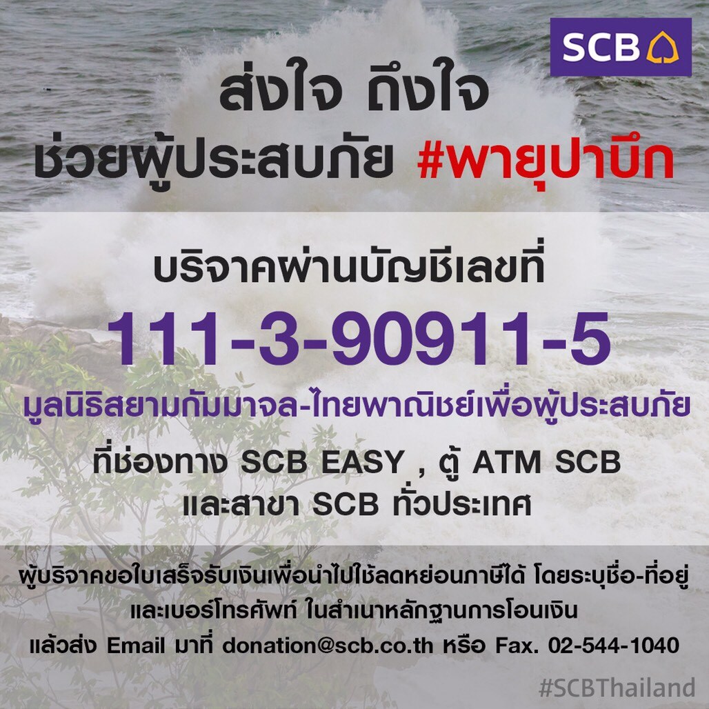 1) บริจาคผ่านบัญชี “มูลนิธิสยามกัมมาจล-ไทยพาณิชย์เพื่อผู้ประสบภัย” เลขที่ 111-3-90911-5 ได้ทุกสาขาธนาคาร หรือทาง SCB Easy