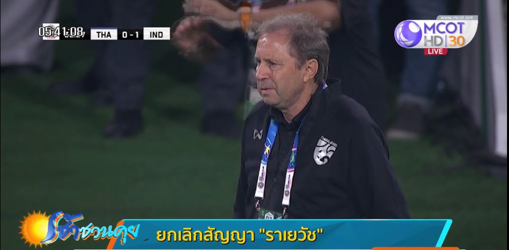 กรุงเทพฯ 7 ม.ค.-นายกสมาคมกีฬาฟุตบอลแห่งประเทศไทยฯ ประกาศยุติสัญญา “มิโรวาน ราเยวัช” พ้นหน้าที่คุมทีมฟุตบอลทีมชาติไทย หลังพาทีมชาติไทย พ่าย อินเดีย 1-4 ในฟุตบอลเอเชียนคัพ 2019 รอบสุดท้าย กลุ่ม A นัดแรก พร้อมประกาศแต่งตั้ง “ศิริศักดิ์ ยอดหญ้าไทย-โชคทวี พรหมรัตน์” ทำหน้าที่คุมทีมลุยศึกเอเชียนคัพต่อ