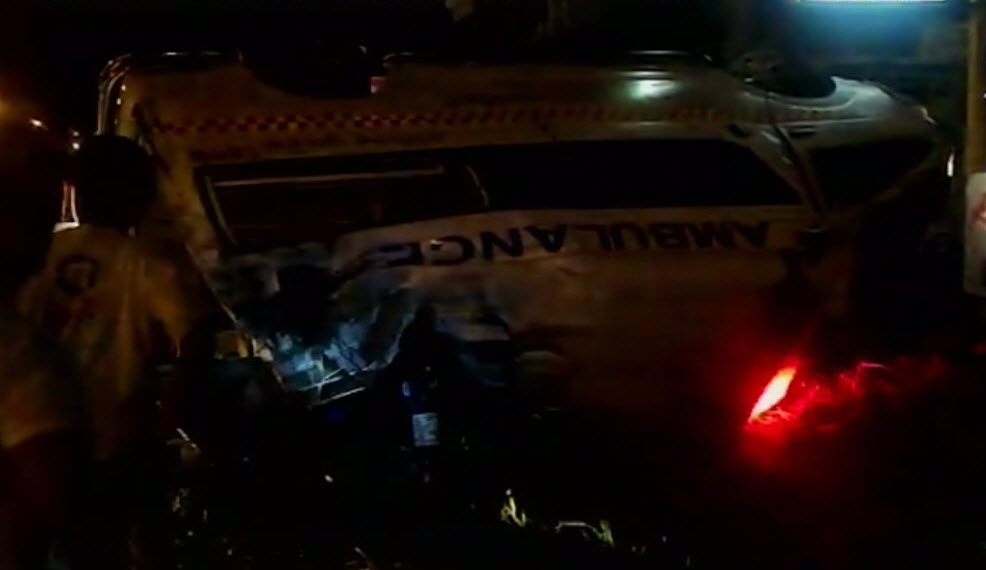 ปราจีนบุรี 5 ก.ย. – รถฉุกเฉินรับส่งผู้ป่วยโรงพยาบาลกบินทร์ จ.ปราจีนบุรี หลบรถที่ รปภ.โบกให้ออกจากห้างสรรพสินค้า จนเสียหลักพลิกคว่ำฟาดกับเสาไฟบาดเจ็บ 5 คน