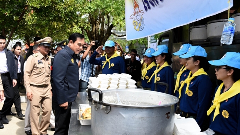 โดยนายกรัฐมนตรี ได้แวะทักทาย และให้กำลังใจเจ้าหน้าที่ในการปฏิบัติงาน พร้อมชิมไก่ทอดและไข่เจียวของโรงครัวพระราชทาน และชมว่าอร่อยรสชาติดี และได้ร่วมปรุงอาหารคั่วกลิ้งหมู นอกจากนี้ได้มอบอุปกรณ์การเรียนและอุปกรณ์กีฬาให้เด็กนักเรียน และร่วมรับประทานอาหารกับชาวบ้านอย่างเป็นกันเอง