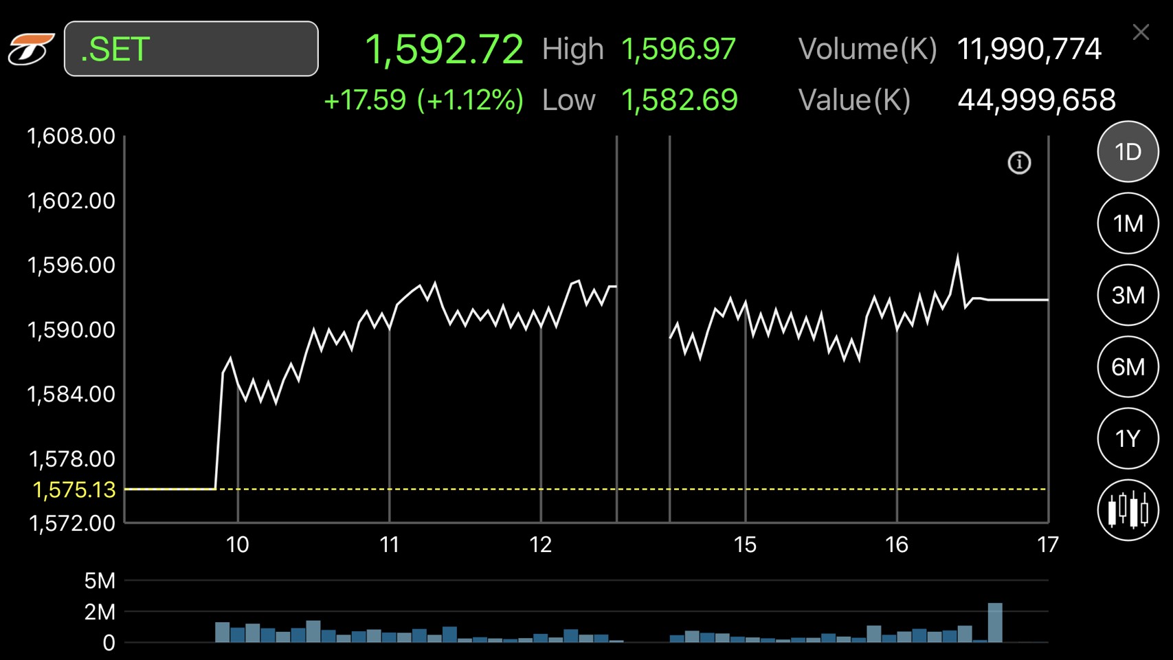 ผู้สื่อข่าวรายงานว่าดัชนีตลาดหลักทรัพย์ฯ ปิดที่ระดับ 1,592.72 จุด เพิ่มขึ้น 17.59 จุด หรือร้อยละ1.12 มูลค่าการซื้อขาย 44,999.66 ล้านบาท การซื้อขายหุ้นวันนี้ (7 ม.ค.) ดัชนีหุ้นไทยเคลื่อนไหวแดนบวกตลอดทั้งวัน โดยดัชนีฯ แตะจุดสูงสุดที่ 1,596.97 จุด และแตะจุดต่ำสุดที่ระดับ 1,582.69 จุด
