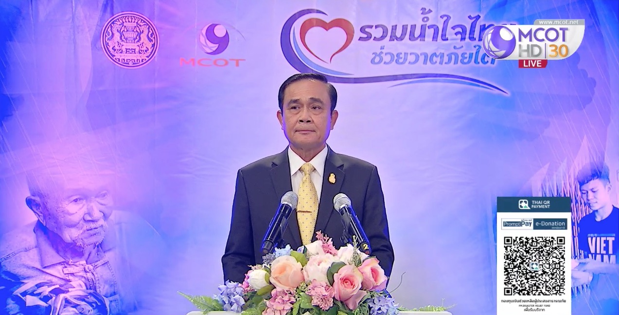 พล.อ.ประยุทธ์ จันทร์โอชา นายกรัฐมนตรี เดินทางมาเป็นประธานรับบริจาคเงินรายการ”รวมน้ำใจไทย ช่วยวาตภัยใต้” ที่สำนักนายกรัฐมนตรี ร่วมกับบริษัท อสมท จำกัด (มหาชน) จัดขึ้นเพื่อระดมความช่วยเหลือบรรเทาความเดือดร้อนเเละสร้างขวัญกำลังใจให้พี่น้องประชาชนในพื้นที่ 16 จังหวัดภาคใต้ ที่ได้รับผลกระทบจากปัญหาวาตภัยพายุปาบึก อีกทั้งเพื่อเปิดโอกาสให้หน่วยงานต่างๆ ทุกภาคส่วน ได้เเสดงน้ำใจร่วมบริจาคเงิน โดยได้ร่วมบริจาคเงินส่วนตัว 1 เเสนบาท เเละได้ร่วมรับสายบริจาคด้วยตนเอง ขณะที่มีหน่วยงานทั้งภาครัฐเเละเอกชนเดินทางมาร่วมบริจาคเงินจำนวนมาก อาทิ กระทรวงแรงงาน 2,150,000 บาท กระทรวงเกษตรและสหกรณ์ 1 ล้าน ตลาดหลักทรัพย์แห่งประเทศไทย 4,100,000 บาท กลุ่มบริษัท ปตท. จำกัด(มหาชน) ร่วมกับกลุ่มบริษัท ไทยออยล์ เอนเนอร์ยี เซอร์วิส จำกัด 30 ล้านบาท ธนาคารเพื่อการเกษตรเเละสหกรณ์การเกษตร 1 ล้าน สำนักงานสลากกินเเบ่งรัฐบาล 5 ล้านบาท การไฟฟ้าส่วนภูมิภาค 2 ล้านบาท การไฟฟ้าฝ่ายผลิตแห่งประเทศไทย 10 ล้านบาท การไฟฟ้านครหลวง 1 ล้านบาท กระทรวงการคลัง 10,450,000 บาท การกีฬาแห่งประเทศไทย 1 แสน บริษัท คิง เพาเวอร์ 5 ล้านบาท บริษัท โตโยต้า มอเตอร์ ประเทศไทย จำกัด 1 ล้านบาท การประปานครหลวง 5 เเสนบาท การประปาภูมิภาค 5 แสนบาท บริษัท น้ำดื่มรีเจนซี่ จำกัด 2 ล้านบาท บริษัท ไทยเบฟเวอเรจ จำกัด(มหาชน) 5 ล้านบาท และบริษัท เถ้าแก่น้อย ฟู๊ดแอนด์มาร์เก็ตติ้ง 2 ล้านบาท