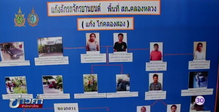 นายไพรัช นางกาญจนา นายชลทิศ ฮังนนท์ นายมานพ ศรีเมือง นายวันชัย ธรรมธร และนายลี นายจอ 2 ชาวพม่า ถูกชุดสืบสวน สภ.คลองหลวง จับกุมพร้อมของกลางรถยนต์ที่ใช้ก่อเหตุลักรถจักรยานยนต์