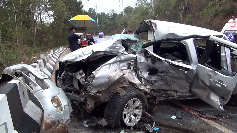 ลำปาง 8 ม.ค.- ลำปางฝนตก รถกระบะ อบต.จากเชียงรายจะมาประชุมในเมืองลำปางไถลทางโค้งหมุนกลางถนนสายแจ้ห่ม พ่วง 18 ล้อ แล่นสวนมาพอดีหลบไม่ทันชนเต็มแรง บาดเจ็บ 3