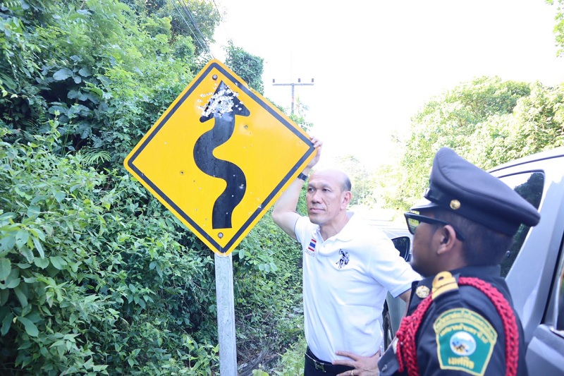 นายอรุณ โสฬส นายกเทศมนตรีตำบลราไวย์ อ.เมือง จ.ภูเก็ต พร้อมเจ้าหน้าที่เทศกิจลงพื้นที่ ม.6 ต.ราไวย์ ตรวจสอบความเสียหายของป้ายบริเวณทางขึ้นแหลมพรหมเทพ เส้นทางหนองน้ำในหาน -สนามฟุตบอลแหลมพรหมเทพ ห่างจากแหลมพรหมเทพ ประมาณ 500 เมตร พบว่ามีทั้งป้ายสัญลักษณ์ ป้ายบอกทาง ป้ายกำหนดความเร็ว 50 กม.ต่อชั่วโมง และป้ายหมายเลขทางหลวง รวมเกือบ 10 ป้าย แต่ละป้ายเป็นรูพรุนจากกระสุนปืนขนาดต่าง ๆ