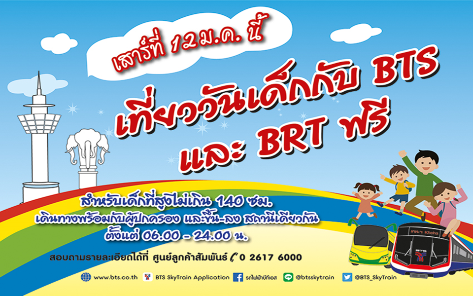 นายสุรพงษ์ เลาหะอัญญา กรรมการผู้อำนวยการใหญ่ บริษัท ระบบขนส่งมวลชนกรุงเทพ จำกัด (มหาชน) หรือบีทีเอส กล่าวว่า เนื่องในโอกาสวันเด็กแห่งชาติเสาร์ที่สองของเดือนมกราคม ซึ่งตรงกับวันเสาร์ที่ 12 มกราคม 2562 ตั้งแต่เวลา 06.00 น. ถึง 24.00 น. บริษัทฯ เปิดโอกาสให้เด็กที่มีส่วนสูงไม่เกิน 140 ซม. นั่งรถไฟฟ้าบีทีเอสฟรีตลอดทุกเส้นทาง ทั้งในส่วนต่อขยายสายสุขุมวิทและสายสีลม รวมถึงรถโดยสารด่วนพิเศษบีอาร์ที เพื่อเป็นการร่วมฉลองวันเด็กแห่งชาติ ส่งเสริมให้เด็ก ๆ ได้เดินทางไปร่วมงาน และทำกิจกรรมร่วมกับครอบครัวได้อย่างสะดวกสบายตามสถานที่ต่างๆ บนเส้นทางรถไฟฟ้าบีทีเอส โดยบริษัทฯ จะจัดเจ้าหน้าที่คอยดูแลอำนวยความสะดวกให้กับเด็ก และผู้ปกครองเดินทางอย่างปลอดภัย ซึ่งสามารถติดต่อขอรับคูปองการเดินทางได้ทุกสถานี