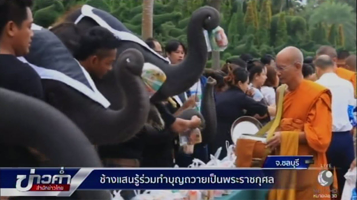 ขณะที่สวนนงนุชนำช้างแสนรู้ร่วมพิธีทำบุญตักบาตร ข้าวสารอาหารแห้งพระสงฆ์ 140 รูปที่บรรพชาอุปสมบท ในวันครบรอบปัญญาสมวาร 50 วัน เพื่อถวายเป็นพระราชกุศลแด่พระบาทสมเด็จพระปรมินทรมหาภูมิพลอดุลยเดช.-สำนักข่าวไทย