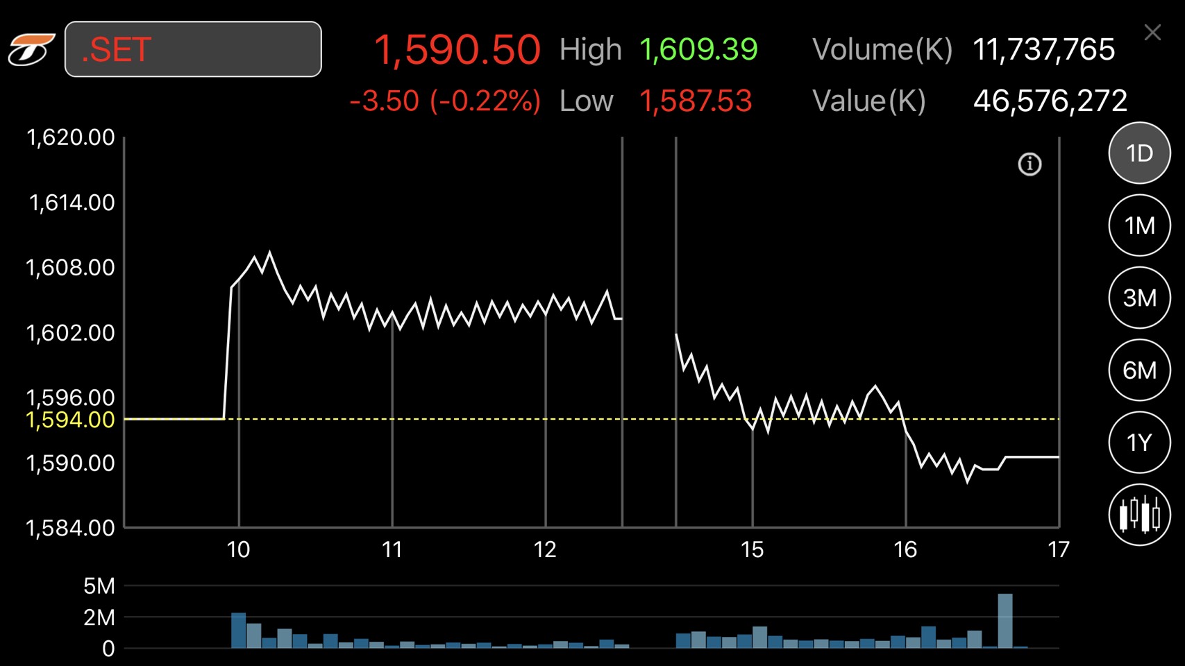 การซื้อขายหุ้นวันนี้ ดัชนีหุ้นไทยแกว่งไซด์เวย์เช่นเดียวกับตลาดภูมิภาค โดยดัชนีฯ แตะจุดสูงสุดที่ 1,599.10 จุด และแตะจุดต่ำสุดที่ระดับ 1,579.20 จุด