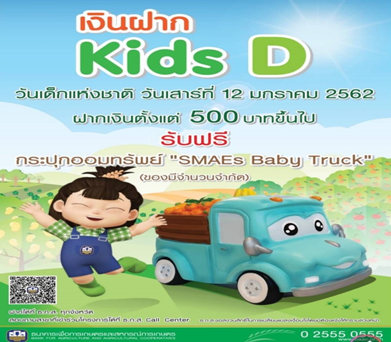 นายอภิรมย์ สุขประเสริฐ ผู้จัดการ ธนาคารเพื่อการเกษตรและสหกรณ์การเกษตร (ธ.ก.ส.) เปิดเผยว่า ธ.ก.ส.ได้จัดทำกระปุกออมทรัพย์ SMAEs Baby Truck สุดน่ารักเพื่อเป็นของขวัญพิเศษให้กับเด็ก ๆ ที่ร่วมเปิดบัญชีเงินฝากตั้งแต่ 500 บาทขึ้นไป ในวันเสาร์ที่ 12 มกราคม 2562 ตั้งแต่เวลา 08.00 -12.00 น. ณ ธ.ก.ส. สำนักงานใหญ่ บางเขน และที่ทำการ ธ.ก.ส. 697 สาขาทั่วประเทศ เพื่อรณรงค์ให้เด็ก ๆ ทุกคนรักการออม รู้จักการสร้างภูมิคุ้มกันผ่านการออมเงิน เพื่ออนาคตของตนเอง และของประเทศชาติ