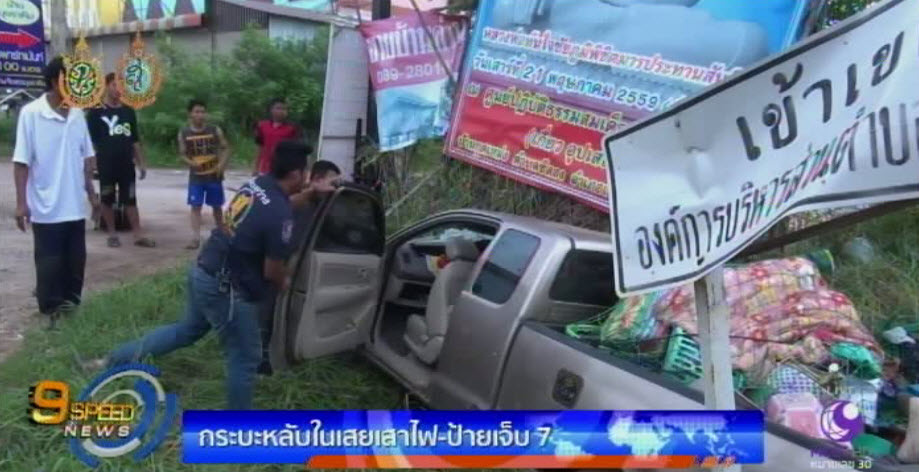 ชัยภูมิ 4 ก.ย. – เกิดอุบัติเหตุรถกระบะพุ่งชนเสาไฟฟ้าและป้ายโฆษณา ริมถนนชัยภูมิ-สีคิ้ว บริเวณหมู่ที่ 1 บ้านหนองนาแซง อำเภอเมืองชัยภูมิ ที่เกิดเหตุพบรถกระบะสีบรอนซ์เงิน ทะเบียน บย 7638 พิษณุโลก สภาพพังยับเยิน เจ้าหน้าที่ต้องใช้เครื่องตัดถ่าง นำผู้บาดเจ็บออกจากตัวรถรวม 7 คน ก่อนนำส่งโรงพยาบาลชัยภูมิ สอบสวนทราบว่า นายชาญณรงค์ ขำใจ ชาวกำแพงเพชร คนขับ พร้อมผู้โดยสารรวม 7 คน เดินทางจากนครปฐม เพื่อไปติดต่องานรับเหมาก่อสร้างที่กาฬสินธุ์ เมื่อมาถึงจุดเกิดเหตุ เกิดหลับใน ทำให้รถเสียหลักพุ่งชนเสาไฟฟ้าและป้ายโฆษณาอย่างรุนแรง เบื้องต้นเตรียมดำเนินคดีขับรถโดยประมาท ทำให้ทรัพย์สินของทางราชการเสียหาย. -สำนักข่าวไทย
