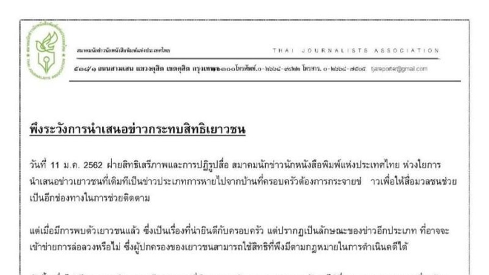 ฝ่ายสิทธิเสรีภาพและการปฏิรูปสื่อ สมาคมนักข่าวนักหนังสือพิมพ์แห่งประเทศไทย ห่วงใยการนำเสนอข่าวเยาวชนที่เดิมทีเป็นข่าวประเภทการหายไปจากบ้านที่ครอบครัวต้องการกระจายข่าวเพื่อให้สื่อมวลชนช่วยเป็นอีกช่องทางในการช่วยติดตาม