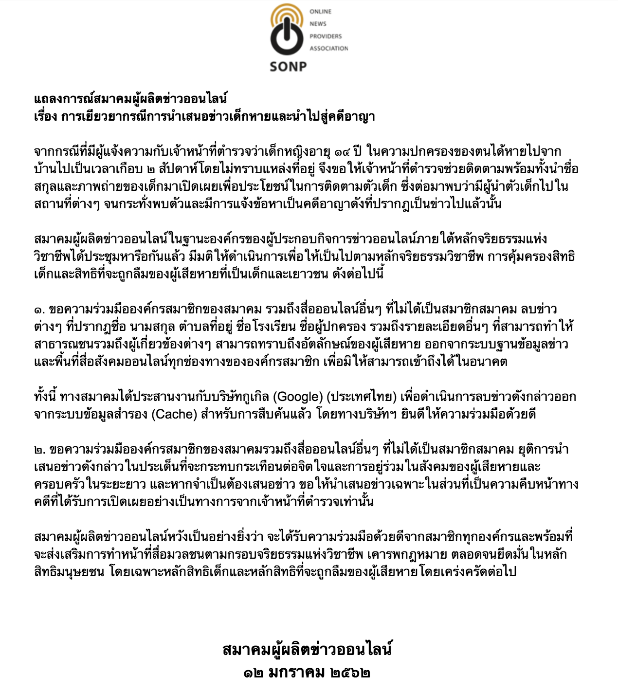 13 ม.ค. – สมาคมผู้ผลิตข่าวออนไลน์ แถลงการณ์ การเยียวยากรณีการนำเสนอข่าวเด็กหายและนำไปสู่คดีอาญา ขอความร่วมมือลบข้อมูลต่างๆ ที่ระบุถึงตัวตนของผู้เสียหาย พร้อมยุติการนำเสนอข่าวดังกล่าวที่กระทบกระเทือนจิตใจและการอยู่ร่วมสังคมในระยะยาว
