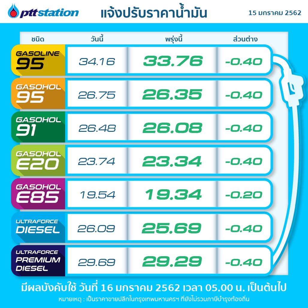 ปตท.-บางจากฯ ปรับลดราคาขายปลีกน้ำมันทุกชนิดลง 40 สตางค์ต่อลิตร ยกเว้น E85 ลดลง 20 สตางค์ต่อลิตร มีผล 16 มกราคม 2562 เวลา 05.00 น. เป็นต้นไป โดยราคาขายปลีกเป็นดังนี้ เบนซิน 95 ลิตรละ 33.76 บาท แก๊สโซฮอล์ 95 ลิตรละ 26.35 บาท E20 ลิตรละ 23.34 บาท แก๊สโซฮอล์ 91 ลิตรละ 26.08 บาท E85 ลิตรละ 19.34 บาท ดีเซล 25.69 บาท และดีเซลพรีเมียม 29.29 บาทต่อลิตร โดยราคาขายปลีกข้างต้นยังไม่รวมภาษีบำรุงกรุงเทพมหานคร.-สำนักข่าวไทย