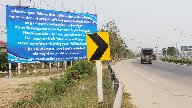 ป้ายคัทเอาท์ขนาดใหญ่ เขียนข้อความใฝ่หานายกรัฐมนตรีที่ไม่โกงกิน เสียสละ มุ่งมั่นตั้งใจจริง ทำงานให้กับประเทศชาติและประชาชนด้วยความสื่อสัตย์สุจริต ถูกนำมาติดตั้งริมถนนเพชรเกษม หมู่ 1 ต.วังเย็น อ.บางแพ จ.ราชบุรี ทำให้ผู้สัญจรมุ่งหน้าเข้า กทม. ต่างชะลออ่านข้อความบนป้ายและถ่ายรูป เมื่อสอบถามชาวบ้านละแวกนั้นทราบเพียงว่า เมื่อเย็นวานนี้ (14 ม.ค.) มีชายประมาณ 2-3 คน นำป้ายมาติดตั้ง และไม่ทราบว่าเป็นของใครมีจุดประสงค์อะไร