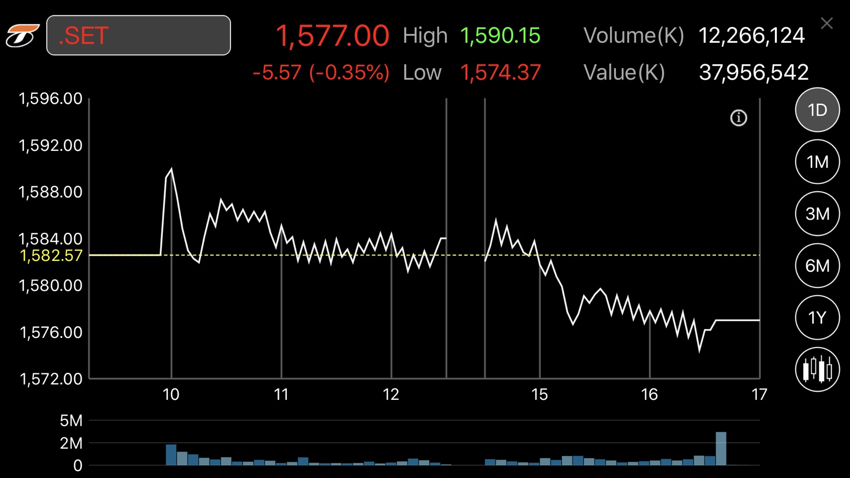 ผู้สื่อข่าวรายงานว่าดัชนีตลาดหลักทรัพย์ฯ ปิดวันนี้ (15 ม.ค.) ที่ระดับ 1,577.00 จุด ลดลง 5.57 จุด หรือร้อยละ 0.35 มูลค่าการซื้อขาย 37,956.54 ล้านบาท การซื้อขายหุ้นวันนี้ดัชนีเคลื่อนไหวทั้งแดนบวก-ลบ โดยดัชนีฯ แตะจุดสูงสุดที่ 1,590.15 จุด และแตะจุดต่ำสุดที่ระดับ 1,574.37 จุด