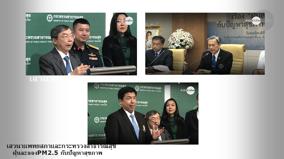 สธ.17ม.ค.-แพทยสภา ระดมความคิดเห็นจากราชวิทยาลัยแพทย์ต่อปัญหาฝุ่นละออง PM 2.5 เตรียมสรุปเสนอนายกรัฐมนตรีเพื่อนำไปแก้ไข โดยปัญหาฝุ่นขณะนี้ ควรมีมาตรการ ทั้งลด ละ เลิก และงด สำหรับประชาชนมากกว่า เพราะหากปล่อยให้เผชิญกับฝุ่นละออง ทั้งพื้นที่ ส้ม แดงนานนับปีเท่ากับคนสูบบุหรี่นานถึง 30 ปี ห่วงเด็กเล็ก อนุบาลและประถมศึกษา