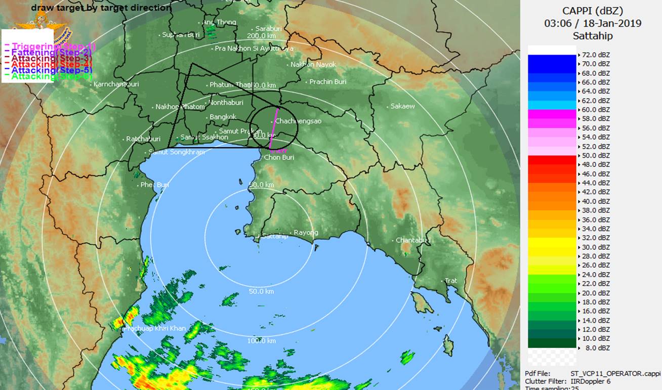 “วันนี้เราจำเป็นต้องทำฝน โดยไปวางแกนก่อเมฆ แนว อ.พานทอง จ.ชลบุรี ไล่ไปถึง อ.บางปะกง บางน้ำเปรี้ยว จ.ฉะเชิงเทรา เป็นการวางแกนเมฆแนวเดียว ให้ก่อไอน้ำก่อตัวเป็นก้อนเมฆ หากการพัฒนาของเมฆดีดังที่หวัง คาดว่าจะทำให้เกิดฝนตกไม่มากก็น้อยในกรุงเทพฯ แม้ว่าในวันนี้สถานการณ์ฝุ่นละอองค่อนข้างดีขึ้น แต่จากการคาคการณ์ของกรมอุตุนิยมวิทยา ในวันที่ 19 ม.ค. และวันต่อไป ปริมาณฝุ่นละอองขนาดเล็กที่ส่งผลกระทบต่อสุขภาพจะมากขึ้น ในกรณีที่กระแสลมไม่พัดพา จึงตัดสินใจขึ้นบินปฏิบัติการ เพื่อให้ช่วยลดฝุ่นละอองลงให้มากที่สุด” นายสุรสีห์ กล่าว. – สำนักข่าวไทย